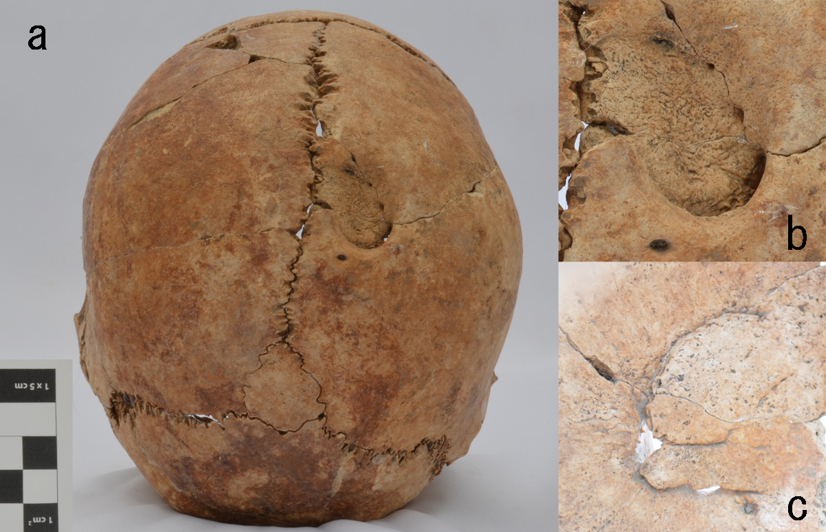 Fig.1.Example of violence-related trauma in the Late Cajamarca Period in Pacopampa in the northern highlands of Peru. (a) Depressed skull fracture in the right parietal bone (specimen No. 13PC-G-Ent 01), (b) a magnification of the fracture from the superior view, and (c) a magnification of the fracture from the inferior view (Tomohito Nagaoka, Yuji Seki, Mauro Ordoñez Livia, Daniel Morales Chocano, Depressed skull fracture at Pacopampa in the Peru’s northern highlands in the Late Cajamarca Period. Anthropological Science, 2020, accepted). ©Pacopampa Archaeological Project
